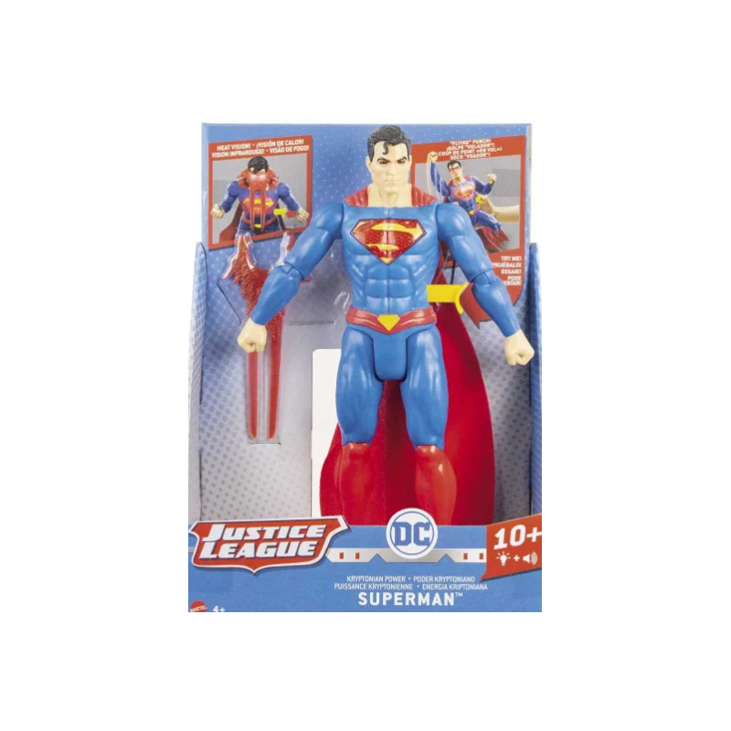 Disfruta una batalla de DC realista con esta figura de Superman¿ que cuenta con luces y sonidos y un auténtico golpe volador. El juguete de lujo Man of Steel¿ viene a escala de 30 centímetros con su icónico traje de batalla azul con rojo, una capa de tela y 11 puntos de articulación. ¡Simplemente aprieta el botón de su pecho para ver como el logo de Superman se ilumina y por sus ojos sale la visión de calor! ¡O tira del gatillo en su espalda para activar las luces, los sonidos y los golpes! Además, hace sonidos de batalla característicos como golpes sónicos, explosiones y vuelos para aumentar la emoción del juego. ¡Vuela y salva Metropolis con esta dinámica figura de acción con luces de Superman!