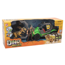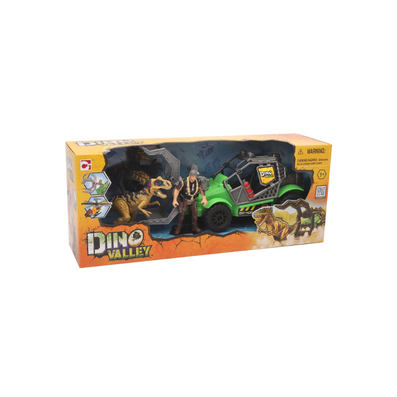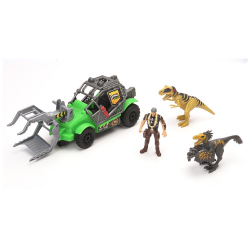 Set de Juego compuesto por un dinosaurio, una figura humano y un vehículo para que recrees historias fantásticas de estas prehistóricas criaturas.