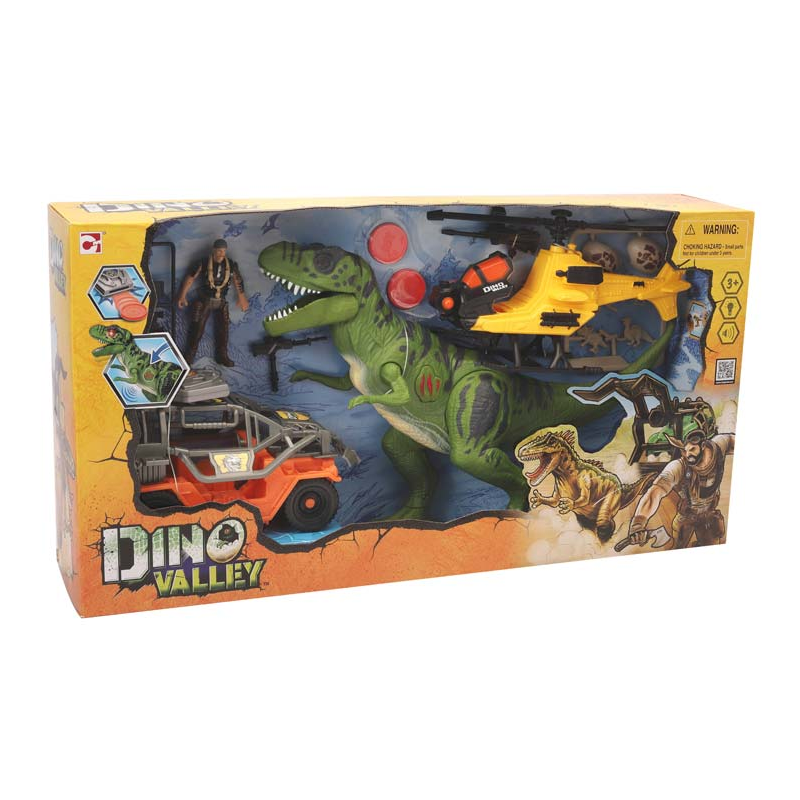 Set de Juego compuesto por un dinosaurio T-Rex, una figura humano, un vehículo y un helicóptero, para que recrees historias fantásticas de estas prehistóricas criaturas.